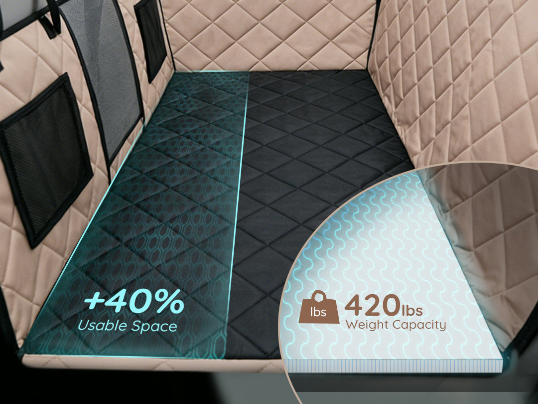 The hard bottom base expands your dog’s usable space by 40%, allowing room to sit, stretch, or lie down comfortably. Beneath it, the reinforced load bearing plate provides stable support up to 420 lbs, keeping the seat secure even for larger dogs.