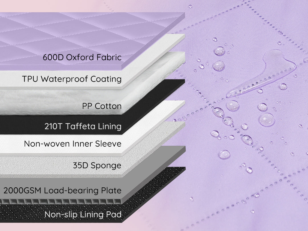 The top layers of this dog car seat cover feature waterproof 600D Oxford fabric with TPU coating to block spills and accidents. Besides, soft padding and a reinforced load bearing plate provide stable support and lasting comfort, combining protection for your car with comfort for your pet.