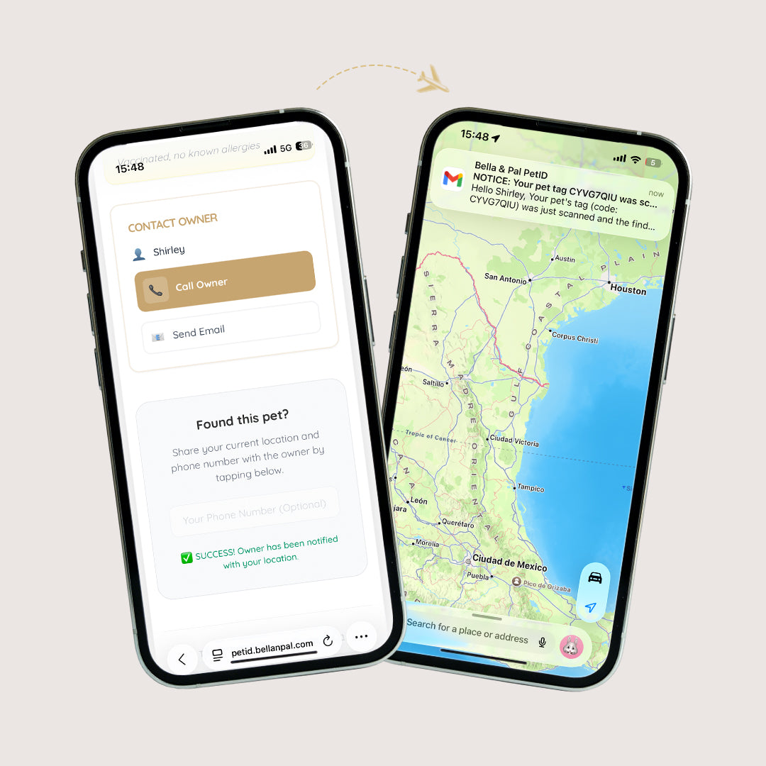 When someone scans the tag, it opens a page in the scanner’s mobile browser. The browser may ask the scanner if they would like to share their location. If they agree, the location can be sent to the owner so they can quickly see where the pet was found. The scanner can also choose not to share their location and instead send their phone number to the owner for contact.