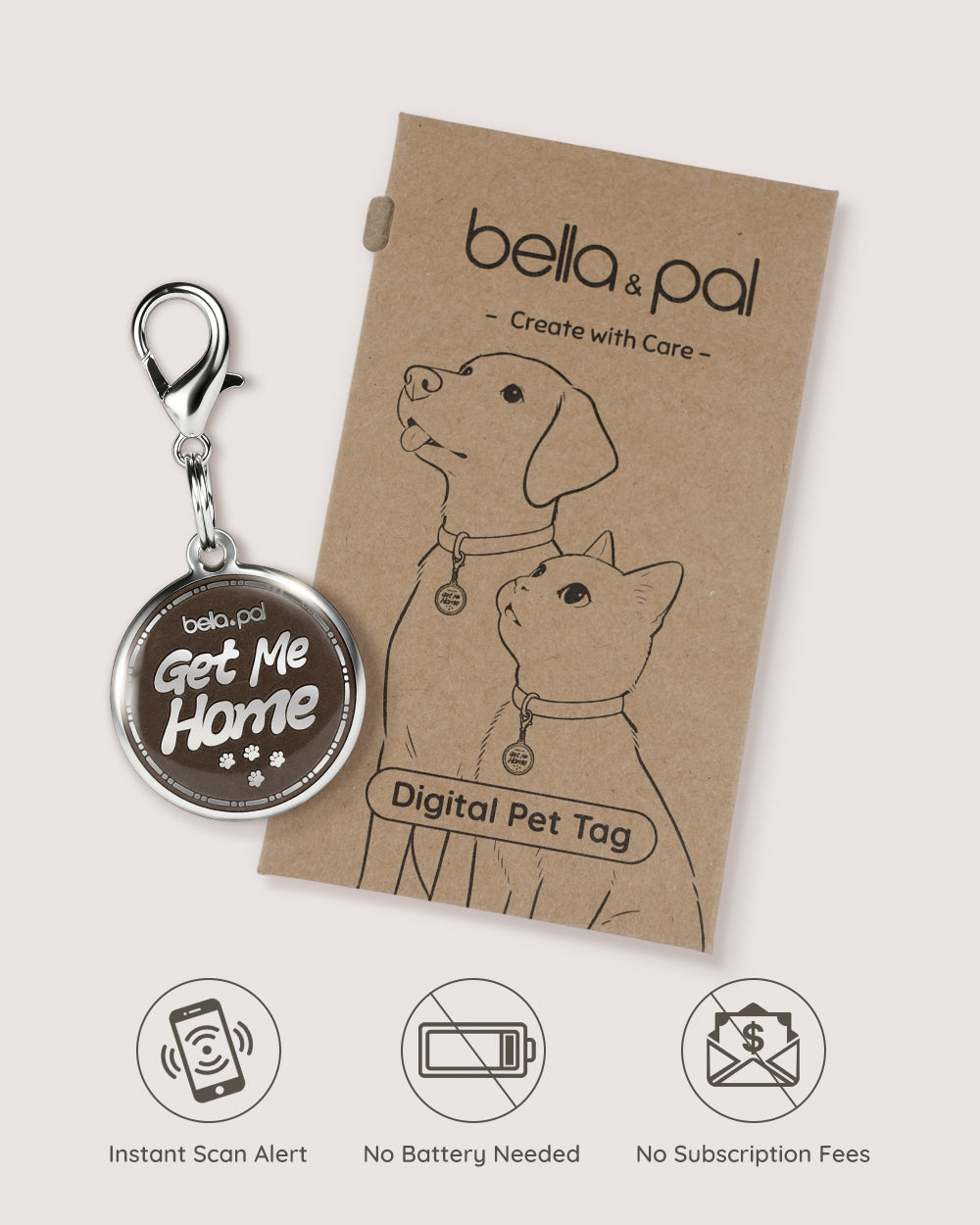 Bella & Pal Digital Pet ID Tag works without apps, charging, or subscriptions.